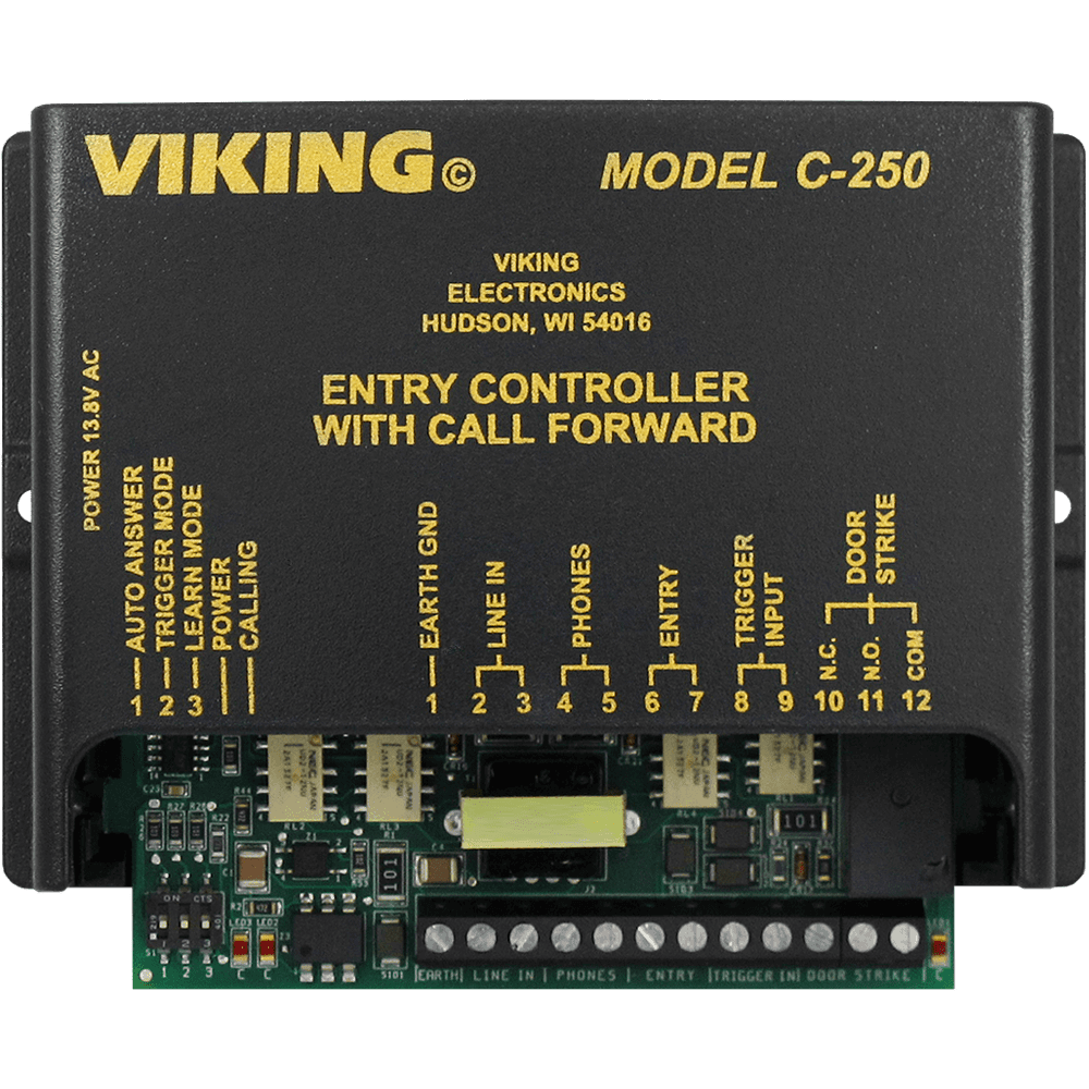 The Viking C-250 allows you to use a single Viking door entry phone with single line telephones or a telephone system. Tenants can converse with the visitor and let them in with a touch-tone command after answering the call.